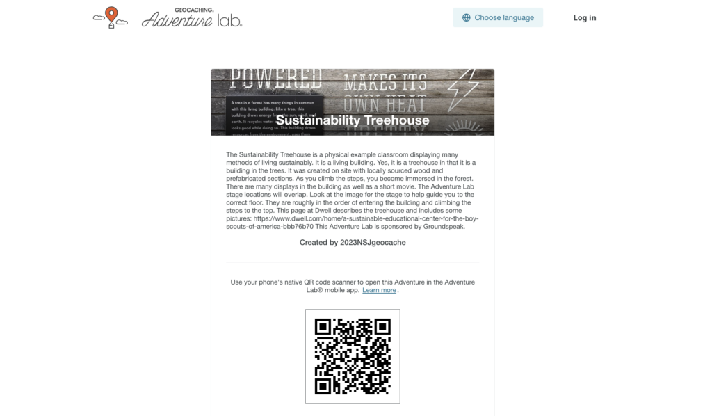 The Sustainability Treehouse is a physical example classroom displaying many methods of living sustainably. It is a living building. Yes, it is a treehouse in that it is a building in the trees. It was created on site with locally sourced wood and prefabricated sections. As you climb the steps, you become immersed in the forest. There are many displays in the building as well as a short movie. The Adventure Lab stage locations will overlap. Look at the image for the stage to help guide you to the correct floor. They are roughly in the order of entering the building and climbing the steps to the top. This page at Dwell describes the treehouse and includes some pictures: https://www.dwell.com/home/a-sustainable-educational-center-for-the-boy-scouts-of-america-bbb76b70 This Adventure Lab is sponsored by Groundspeak.